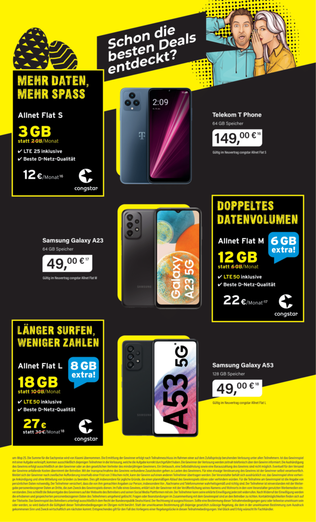 *) Ein Angebot des Fachhändlers. Nur gültig bei erfolgreichem Vertragsabschluss und nur solange der Vorrat reicht. Endgerätepreise nur gültig bei einem Neuvertragsabschluss in Verbindung mit den dargestellten Tarifen und Endgeräten. 1) MagentaMobil PlusKarte mit Smarphone Voraussetzung ist ein bestehender Telekom Mobilfunk-Laufzeitvertrag (XS–XL), vermarktet ab dem 06.09.2019, mit einem monatlichen Grundpreis von mindestens 34,95 €. Ausgeschlossen sind Young Tarife und Tarife der Marke congstar. Monatlicher Grundpreis (mit Smartphone) beträgt 29,95 € für die erste und 19,95 € ab der zweiten PlusKarte. Bereitstellungspreis 19,95 € (MagentaMobil PlusKarte) sowie jeweils 9,95 € (MagentaMobil PlusKarte+). Mindestlaufzeit 24 Monate. Das Inklusivdatenvolumen entspricht dem des zugehörigen Hauptvertrags. Nach Verbrauch des Datenvolumens wird die Bandbreite im jeweiligen Monat auf max. 64 KBit/s (Download) und 16 KBit/s (Upload) beschränkt. Bei Wegfall des Hauptvertrags wird die MagentaMobil PlusKarte (Zweitvertrag) zu den Konditionen des Hauptvertrags fortgeführt. Bei bestehenden MagentaMobil PlusKarten+ als Drittverträgen wird stattdessen einer dieser Verträge zu den Konditionen des Hauptvertrags fortgeführt